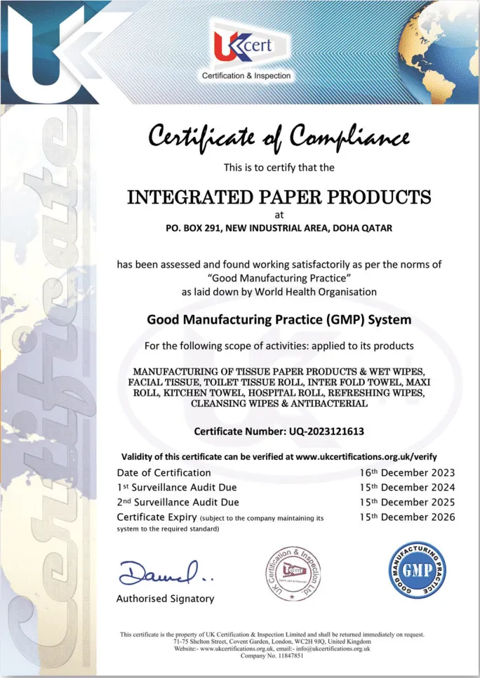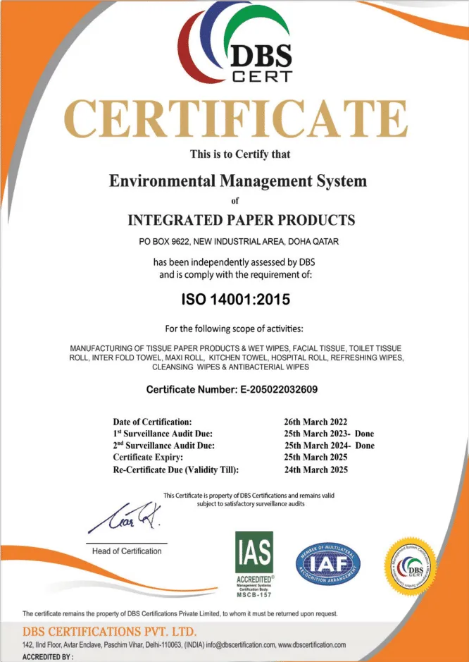 Integrated Paper Products (IPP) Qatar is dedicated to the highest international standards in quality and sustainability. Our certifications demonstrate our commitment to operational excellence, environmental responsibility, and global best practices, ensuring every product meets strict industry benchmarks and exceeds customer expectations.